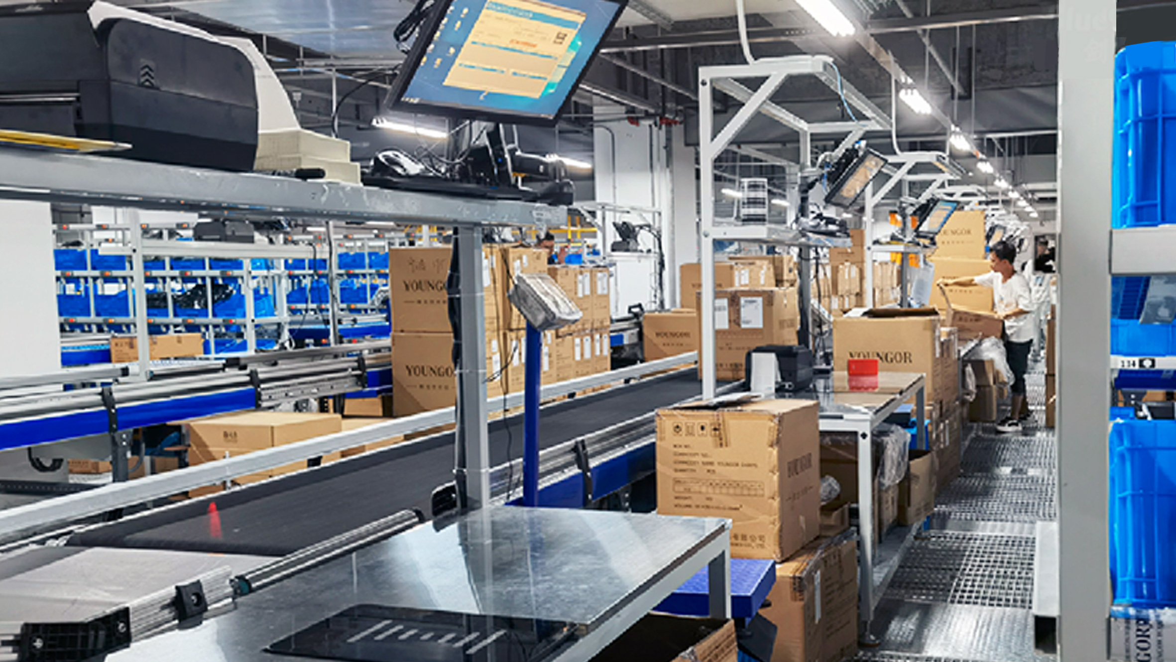 1.5楼是线下营业作业区。。。接纳先提总拣选后播种的方法,,,,提高整体拣选效率,,,,并支持“同款同箱”。。。